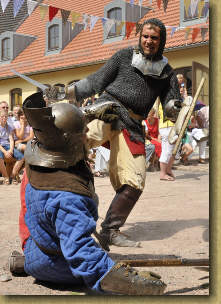 Kampf mit Schwert, Schild, Axt und Stab
