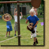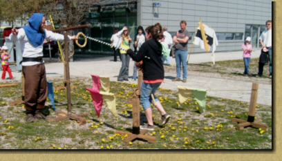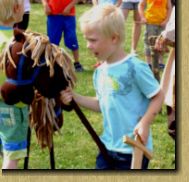 Jetzt gibt es endlich die Möglichkeit den Roland zu stechen oder einen Speer auf eine Sau zu werfen. Ein Kinder-Ritterspiel auf einer, für Kinder gebauten, Turnierbahn. Wie bei den großen Rittern mit galoppierenden Pferden, mit Fahnen und Tuch. |